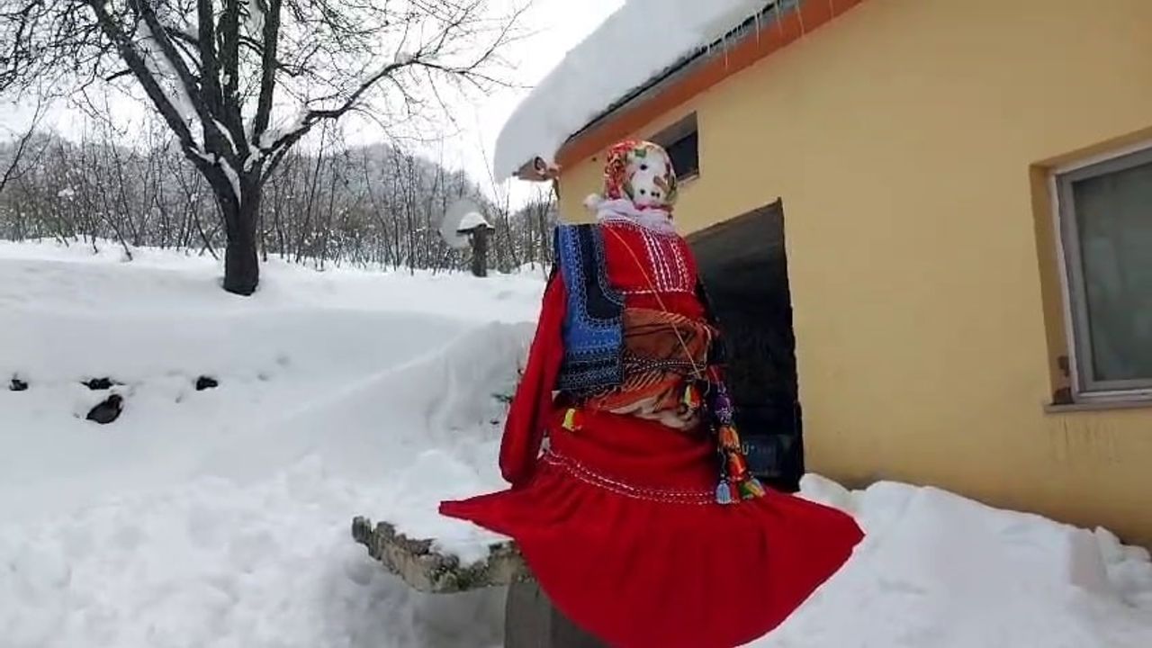 Sakarya’nın Hendek ilçesinin karla kaplanan yüksek kesimlerinde anne ve oğlu, yaptıkları kardan kadına yöresel kıyafetler giydirdi.