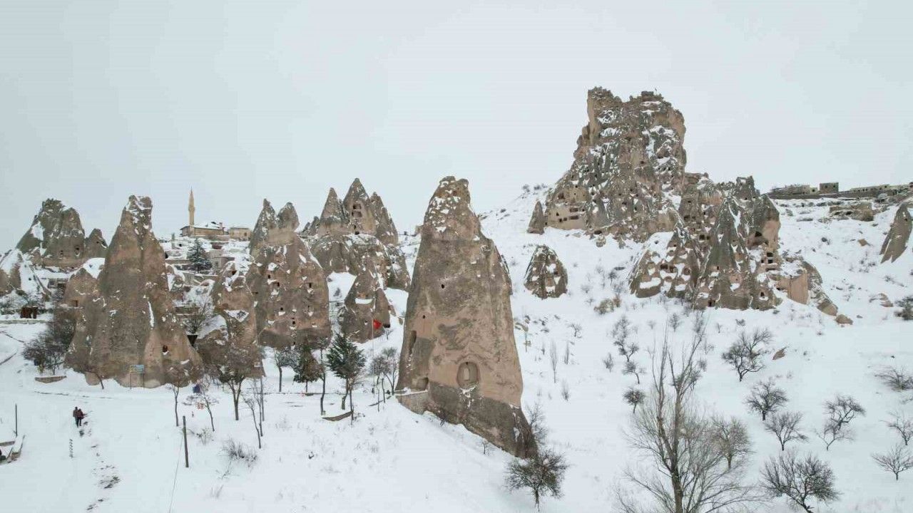 UNESCO Dünya Kültür Mirası Listesi’nde yer alan Kapadokya bölgesinde yağan yoğun kar yağışının ardından peribacaları ortaya kartpostallık görüntüler çıkarttı.