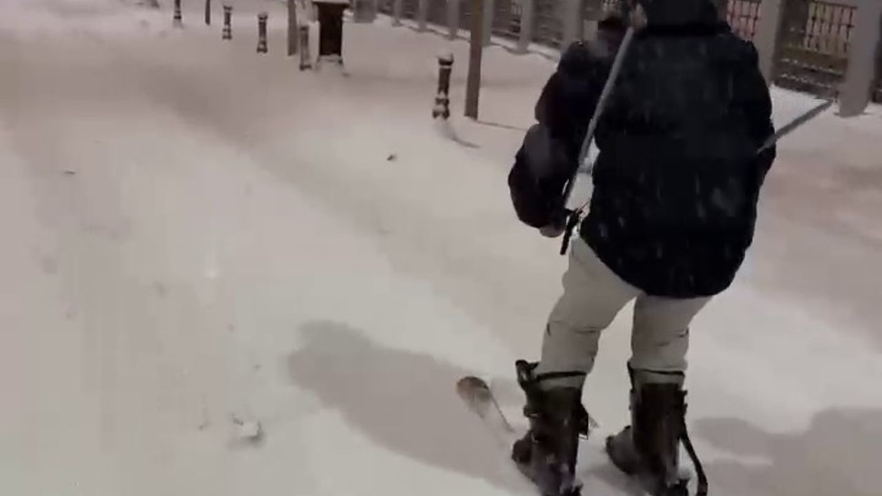 Gece artarak devam eden kar yağışı kent merkezini beyaz örtü gibi kapatırken, bir vatandaş kayaklarını ayağına takarak kent merkezinde kayak yaptı. Yakutiye İlçesi’nde Cumhuriyet Caddesi’ne inen bir sokakta kayan vatandaşı arkadaşları cep telefonlarıyla kaydetti. Sosyal medyada paylaşılan görüntü kışı ve karı ile meşhur olan Erzurum’da oldukça ilgi gördü.
