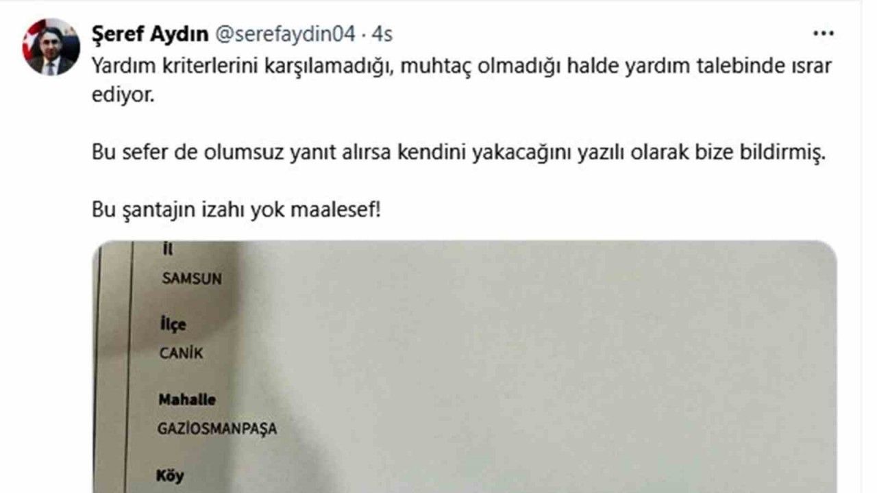 Canik’in Gazi Osmanpaşa Mahallesi’nde ikamet eden bir şahıs, defalarca kez aile yardımına başvurdu. ’Yardım kriterlerini karşılamadığı ve muhtaç olmadığı’ tespit edilen şahsın talebi reddedildi. Şahsın bir kez daha yardım için başvurması ve başvurusuna, "Bu da ret gelirse kaymakamlığın önünde kendimi yakacağım" diye tehdit notu düşmesini içeren belgeyi sosyal medya hesabında paylaşan Samsun Vali Yardımcısı Vekili/Canik İlçe Kaymakamı Şeref Aydın, durumu, "Bu şantajın izahı yok maalesef" diyerek özetledi.