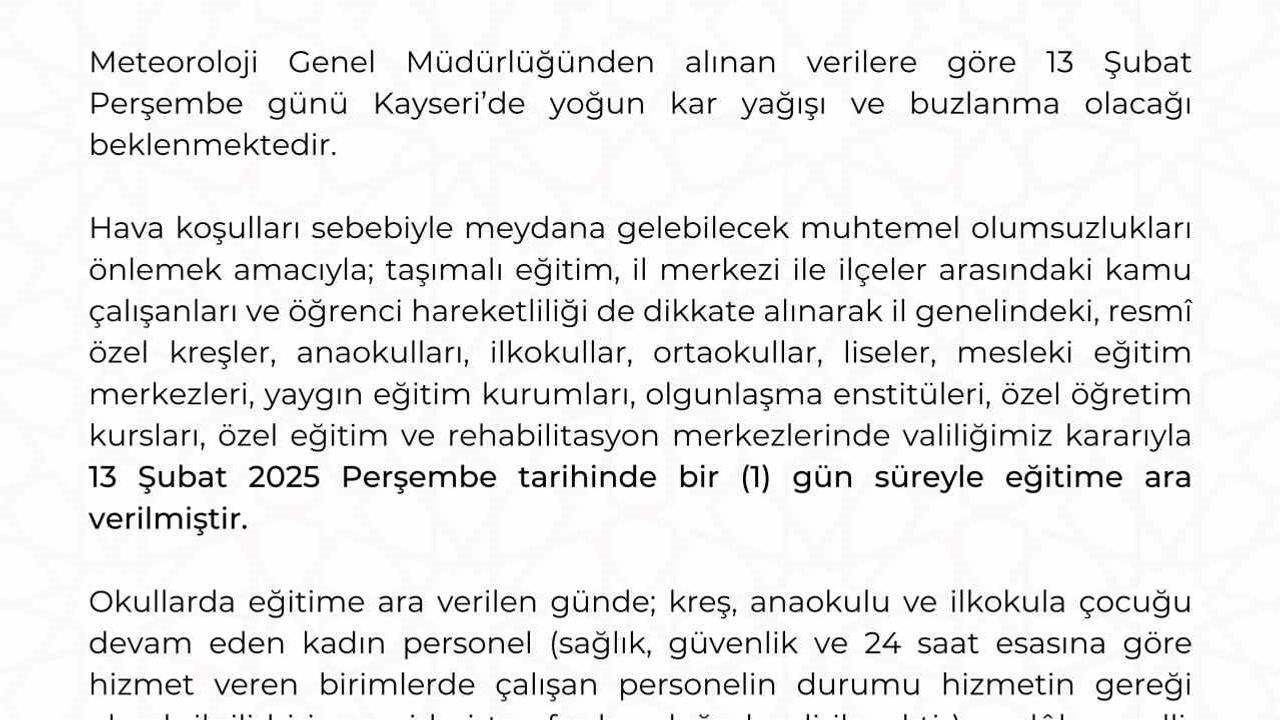 Kayseri Valiliği’nden yapılan açıklamada, "Meteoroloji Genel Müdürlüğünden alınan verilere göre 13 Şubat Perşembe günü Kayseri’de yoğun kar yağışı ve buzlanma olacağı beklenmektedir. Hava şartlarısebebiyle meydana gelebilecek muhtemel olumsuzlukları önlemek amacıyla; taşımalı eğitim, il merkezi ile ilçeler arasındaki kamu çalışanları ve öğrenci hareketliliği de dikkate alınarak il genelindeki, resmî özel kreşler, anaokulları, ilkokullar, ortaokullar, liseler, mesleki eğitim merkezleri, yaygın eğitim kurumları, olgunlaşma enstitüleri, özel öğretim kursları, özel eğitim ve rehabilitasyon merkezlerinde valiliğimiz kararıyla 13 Şubat 2025 Perşembe tarihinde 1 gün süreyle eğitime ara verilmiştir. Okullarda eğitime ara verilen günde; kreş, anaokulu ve ilkokula çocuğu devam eden kadın personel (sağlık, güvenlik ve 24 saat esasına göre hizmet veren birimlerde çalışan personelin durumu hizmetin gereği olarak ilgili birim amirleri tarafından değerlendirilecektir), malul, engelli, ağır kronik rahatsız ve hamile kamu çalışanları da idari izinli sayılacaktır. Kamuoyuna sasygıla duyurulur" ifadelerine yer verildi.