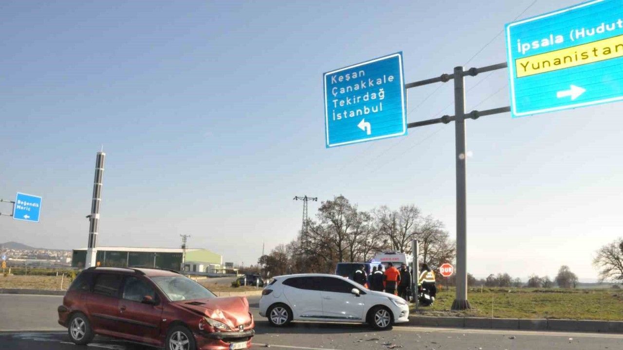 Alınan bilgiye göre, Keşan istikametinden İpsala istikametine giden S.U. yönetimindeki 06 SK 617 plakalı otomobil ile Beyendik Belediyesi istikametinden gelerek, Keşan’a dönüş yapmak için Beyendik Kavşağı’na giriş yapmak isteyen A.S. yönetimindeki 34 DHK 859 plakalı otomobil çarpıştı. Kazada, 06 SK 617 plakalı otomobilin sürücüsü S.U. ile otomobilde yolcu olarak bulunan A.K. ile 34 DHK 859 plakalı otomobilde bulunan M.B. yaralandı.