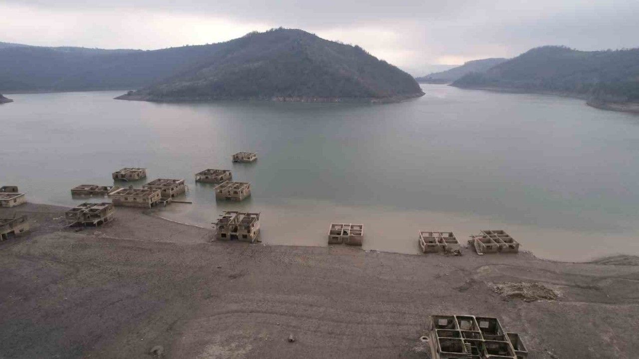 Zonguldak’ta 31 yıl önce işletmeye alınan Kızılcapınar Barajı’nda suların çekilmesiyle birlikte terk edilmiş yapılardan bazıları gün yüzüne çıktı.
