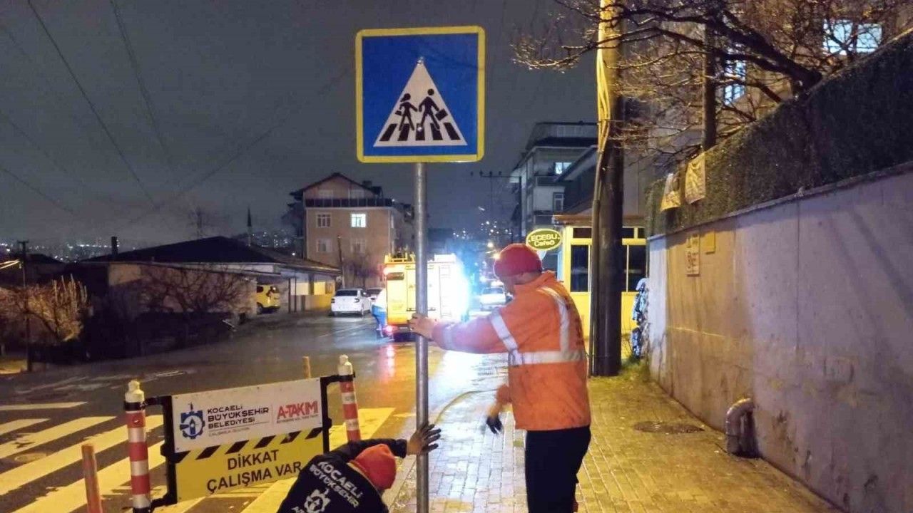 Öte yandan ekipler, İzmit Tepeköy Mahallesi Dr. Ferdi Koçal İlkokulu önünde yaya geçidinin yakınında yan yatan ve devrilme tehlikesi oluşturan yaya yürüme yolu tabelasına müdahale etti. Tabela direği yerinden çıkarılarak, sağlam bir şekilde yeniden monte edildi. Ayrıca yerinden çıkan esnek şerit ve delinatörler de bu kapsamda yenilendi. Yapılan müdahale ile öğrenci, öğretmen ve velilerin okula ulaşımı daha güvenli hale getirildi.