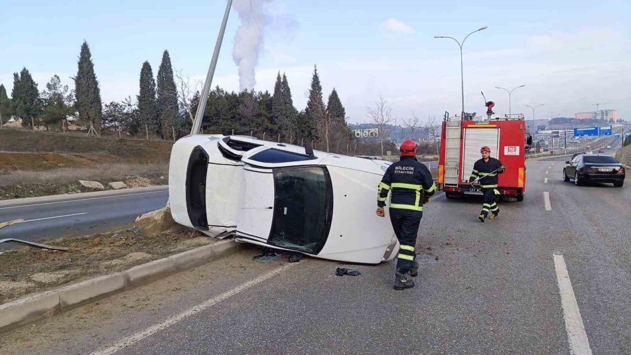 Bilecik’te seyir halinde kontrolden çıkan otomobil orta refüje çarparak devrilirken, araçtan bulunan 2 kişi yaralandı.