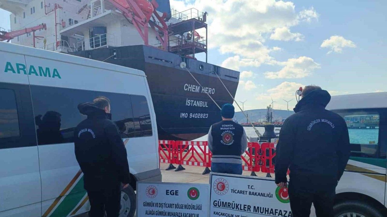 İzmir’in Aliağa ilçesinde limana yanaşan gemide yapılan ölçümde, Gümrük Muhafaza ekipleri 20 tonun üzerinde ibraz edilmeyen kaçak akaryakıt ele geçirdi.