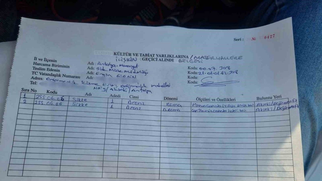 Antalya’da bir lise öğrencisi, hafta sonu ailesiyle gittiği piknik alanında Roma ve Doğu Roma dönemine ait 2 bronz sikke buldu. Genç, bin yıllık olduğu tahmin edilen sikkeleri babası ile birlikte Side Müze Müdürlüğü yetkililerine teslim etti.