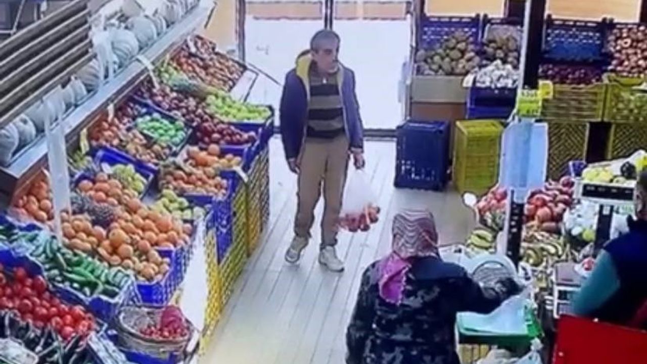 Güvenlik kamerası görüntülerinde ürünleri incelemesi, raflardaki ürünlerden cebine, poşete koyması ve marketten ayrılması yer alıyor.