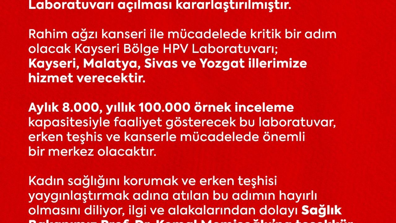 ’Hayırlı Olsun Kayserim’ diyerek müjdeyi duyuran MHP Kayseri Milletvekili Baki Ersoy; "7 Şubat 2025 tarihinde Sağlık Bakanlığı’na verdiğimiz soru önergemiz, bakanlığımız tarafından olumlu değerlendirilmiş ve Kayseri’de Bölgesel HPV Tarama Laboratuvarı açılması kararlaştırılmıştır. Rahim ağzı kanseri ile mücadelede kritik bir adım olacak Kayseri Bölge HPV Laboratuvarı; Kayseri, Malatya, Sivas ve Yozgat illerimize hizmet verecektir. Aylık 8 bin, yıllık 100 bin örnek inceleme kapasitesiyle faaliyet gösterecek bu laboratuvar, erken teşhis ve kanserle mücadelede önemli bir merkez olacaktır. Kadın sağlığını korumak ve erken teşhisi yaygınlaştırmak adına atılan bu adımın hayırlı olmasını diliyor, ilgi ve alakalarından dolayı Sağlık Bakanımız Prof. Dr. Kemal Memişoğlu’na teşekkür ediyorum" dedi.