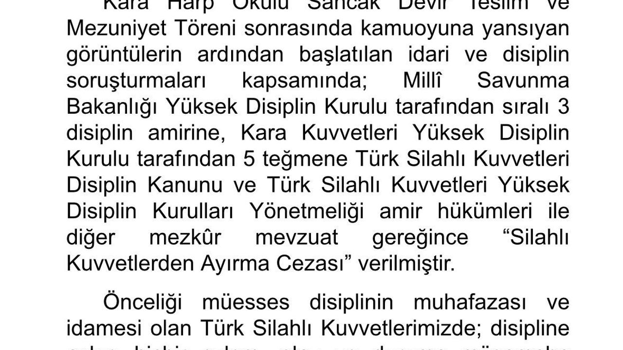 Milli Savunma Bakanlığından yapılan açıklamada, Kara Harp Okulu Sancak Devir Teslim ve Mezuniyet Töreni sonrası kamuoyuna yansıyan görüntülerin ardından başlatılan idari ve disiplin soruşturmalarına ilişkin, "Milli Savunma Bakanlığı Yüksek Disiplin Kurulu tarafından sıralı 3 disiplin amirine, Kara Kuvvetleri Yüksek Disiplin Kurulu tarafından 5 teğmene Türk Silahlı Kuvvetleri Disiplin Kanunu ve Türk Silahlı Kuvvetleri Yüksek Disiplin Kurulları Yönetmeliği amir hükümleri ile diğer mezkûr mevzuat gereğince ’Silahlı Kuvvetlerden Ayırma Cezası’ verilmiştir" ifadeleri kullanıldı.