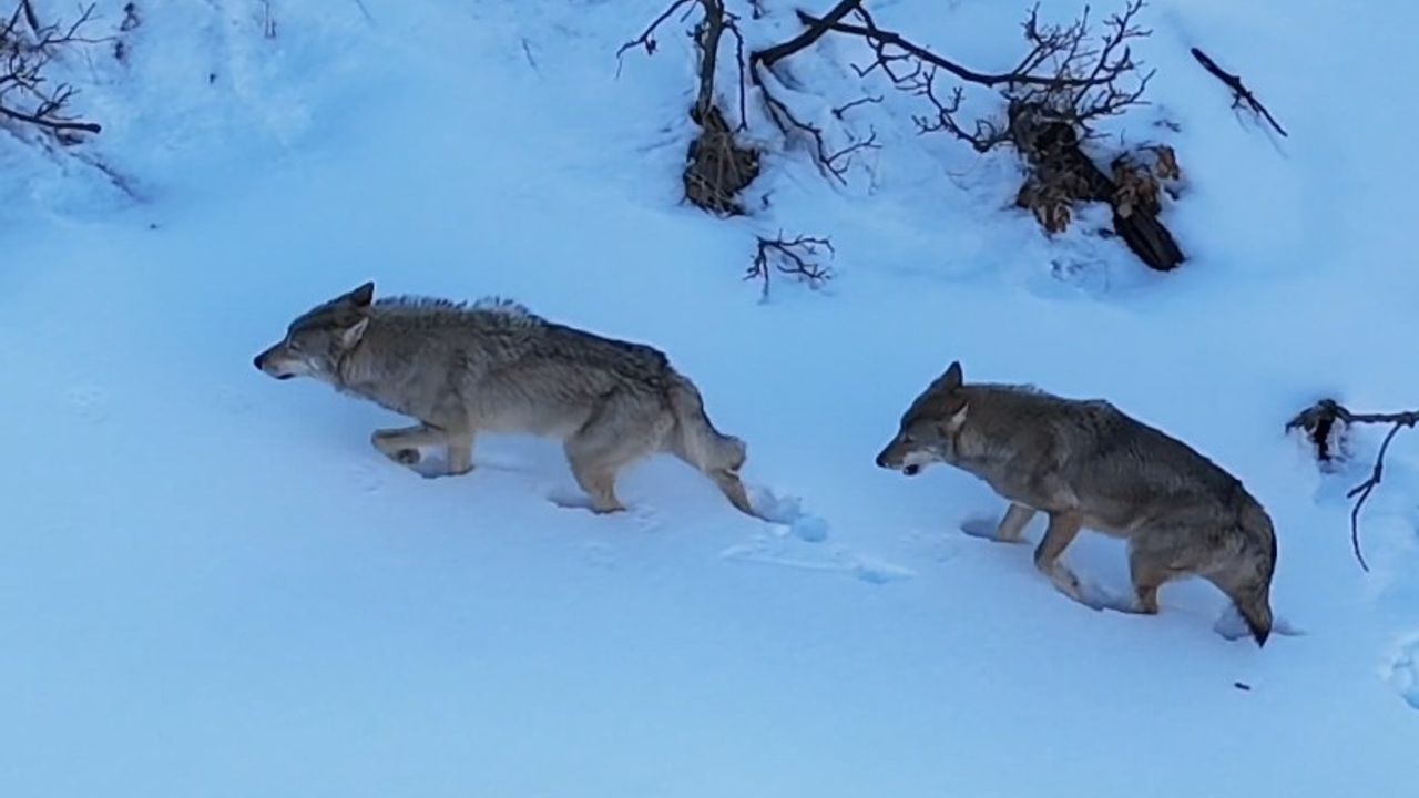 Tunceli’de, Munzur Vadisi Milli Parkı’nda 3 bireyden oluşan kurt ailesi, dron ile görüntülendi.