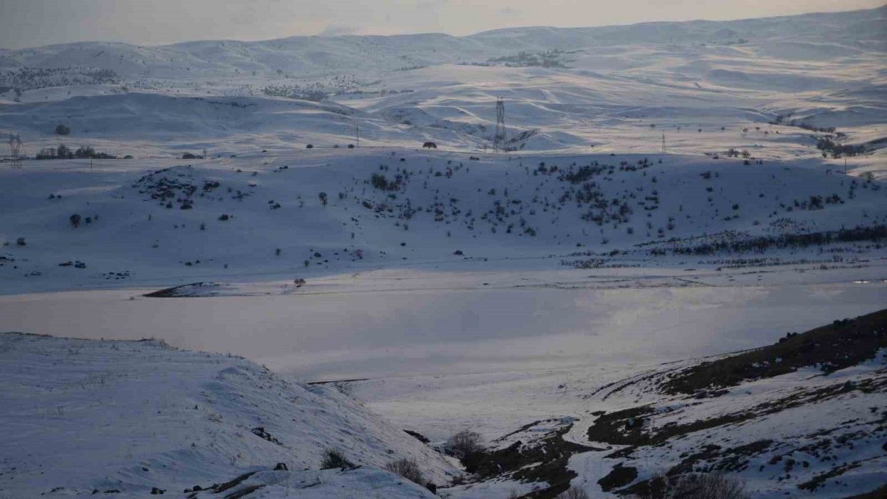 Muş’ta etkili olan soğuk hava nedeniyle Alparslan-2 Barajı’nın yüzeyi buzla kaplandı.