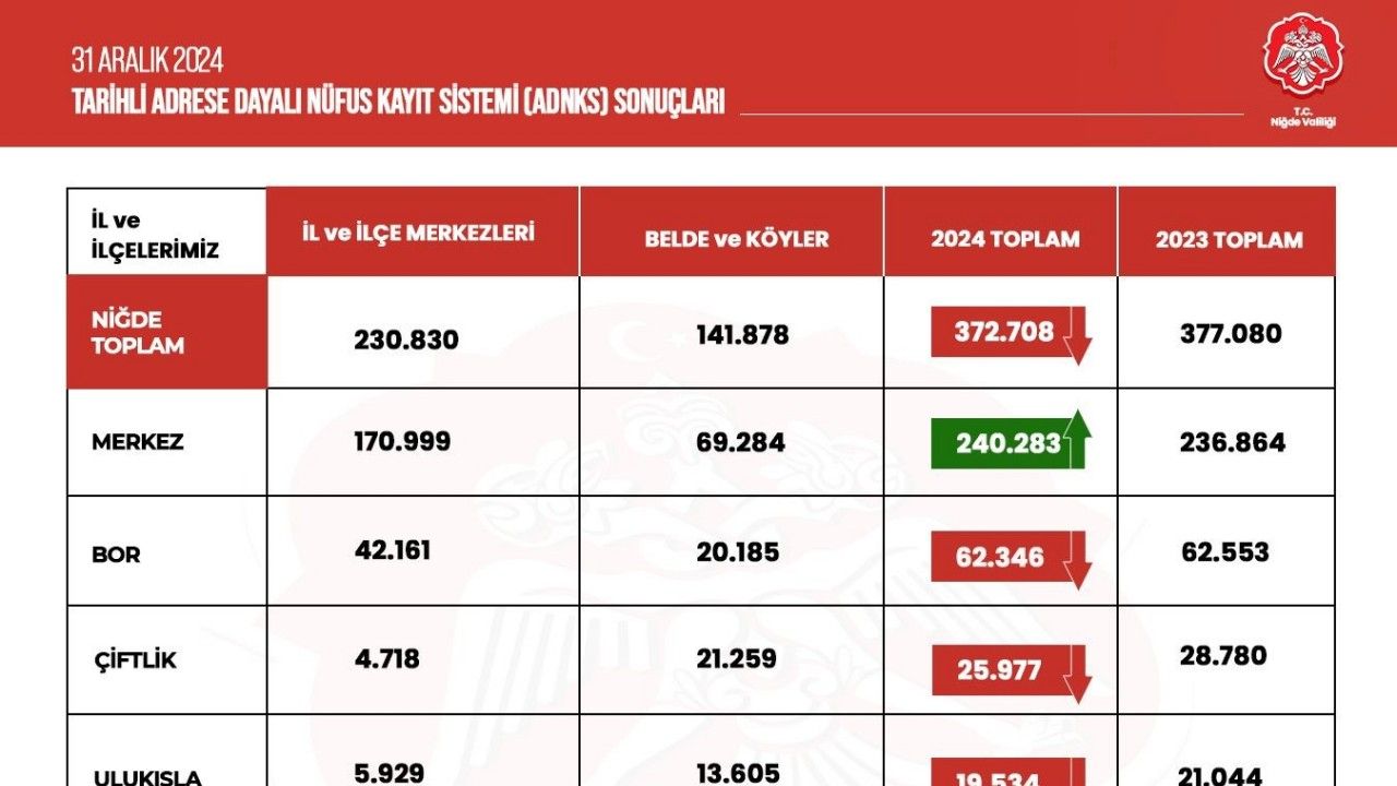 Türkiye İstatistik Kurumu (TÜİK) tarafından açıklanan 31 Aralık 2024 tarihli Adrese Dayalı Nüfus Kayıt Sistemi (ADNKS) verilerine göre, Niğde’nin toplam nüfusu 372 bin 708 olarak açıklandı. 2023’te 377 bin 80 olan nüfus, 4 bin 372 kişilik bir azalma gösterdi. İlçeler bazında değerlendirildiğinde, 2023 yılında 236 bin 864 olan Niğde merkez ilçe nüfusu artış göstererek 2024 yılında 240 bin 283’e yükseldi. Bu artış 3 bin 419 kişi olarak kaydedilirken ilçelerde ise nüfus azaldı.