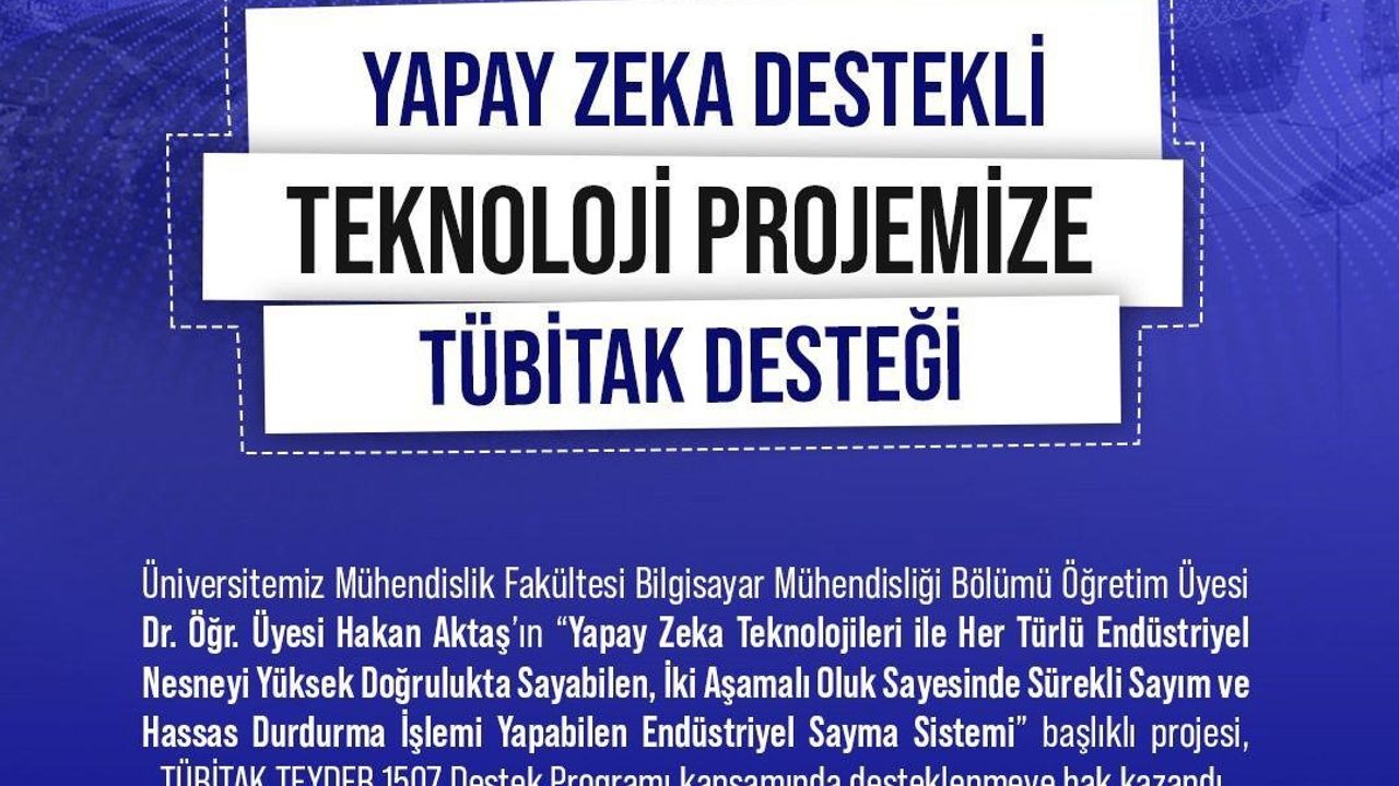 Niğde Ömer Halisdemir Üniversitesi Mühendislik Fakültesi Bilgisayar Mühendisliği Bölümü Öğretim Üyesi Dr. Öğr. Üyesi Hakan Aktaş’ın yürütücüsü olduğu ’Yapay Zeka Teknolojileri ile Her Türlü Endüstriyel Nesneyi Yüksek Doğrulukta Sayabilen, İki Aşamalı Oluk Sayesinde Sürekli Sayım ve Hassas Durdurma İşlemi Yapabilen Endüstriyel Sayma Sistemi’ isimli projesi; TÜBİTAK TEYDEB 1507 destek programı kapsamında desteklenmeye hak kazandı.
