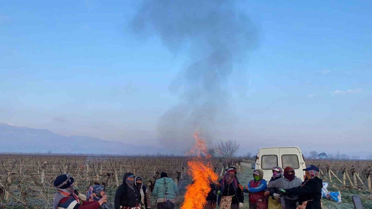 Sarıgöl’de bağ budama işinde çalışan ve sabahın erken saatlerinde işbaşı yapan kadınlar, soğuktan korunmak için ilk iş olarak bağdaki çubukları yakıp etrafında ısınıyor.