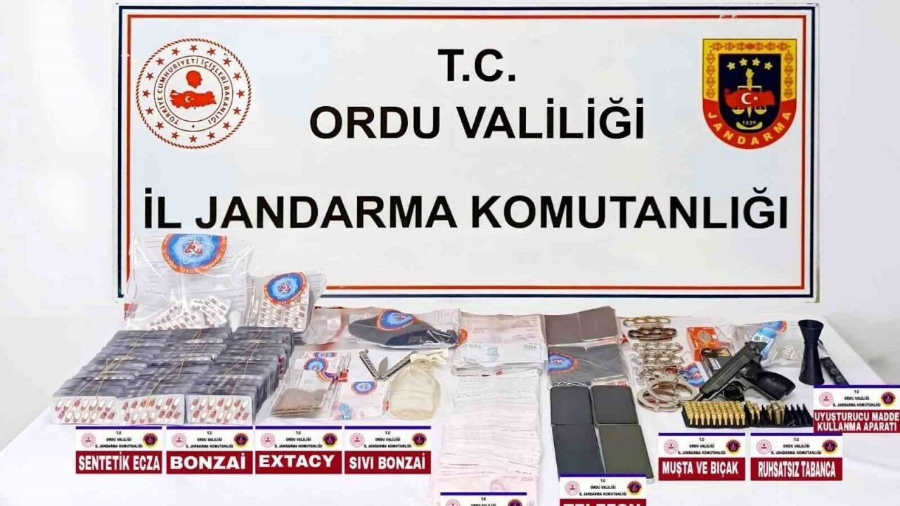 Ünye Cumhuriyet Başsavcılığı koordinesinde, İl Jandarma Komutanlığı ekipleri tarafından Ünye ilçesinde uyuşturucu ticareti ve kullanımına yönelik operasyon düzenlendi. Düzenlenen operasyonda yapılan aramalarda, bin 906 adet sentetik ecza, 22 adet ecstasy, 36 gram bonzai hammaddesi, 56 gram bonzai, 200 milimetre sıvı bonzai, 5 gram kubar esrar, 5 gram kenevir tohumu, 5 adet uyuşturucu kullanma aparatı, 1 ruhsatsız tabanca, 69 adet tabanca fişeği 4 adet muşta, 1 adet sustalı bıçak, 1 adet kelepçe, 36 bin 600 TL suçtan elde edilen para ve 9 adet cep telefonu ele geçirildi.