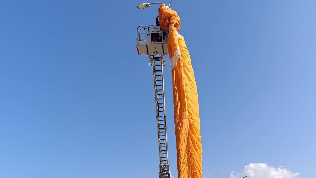 Hatay’ın İskenderun ilçesinde paraşüt ile uçuş gerçekleştiren paraşütçü aydınlatma direğine takılarak mahsur kaldı.