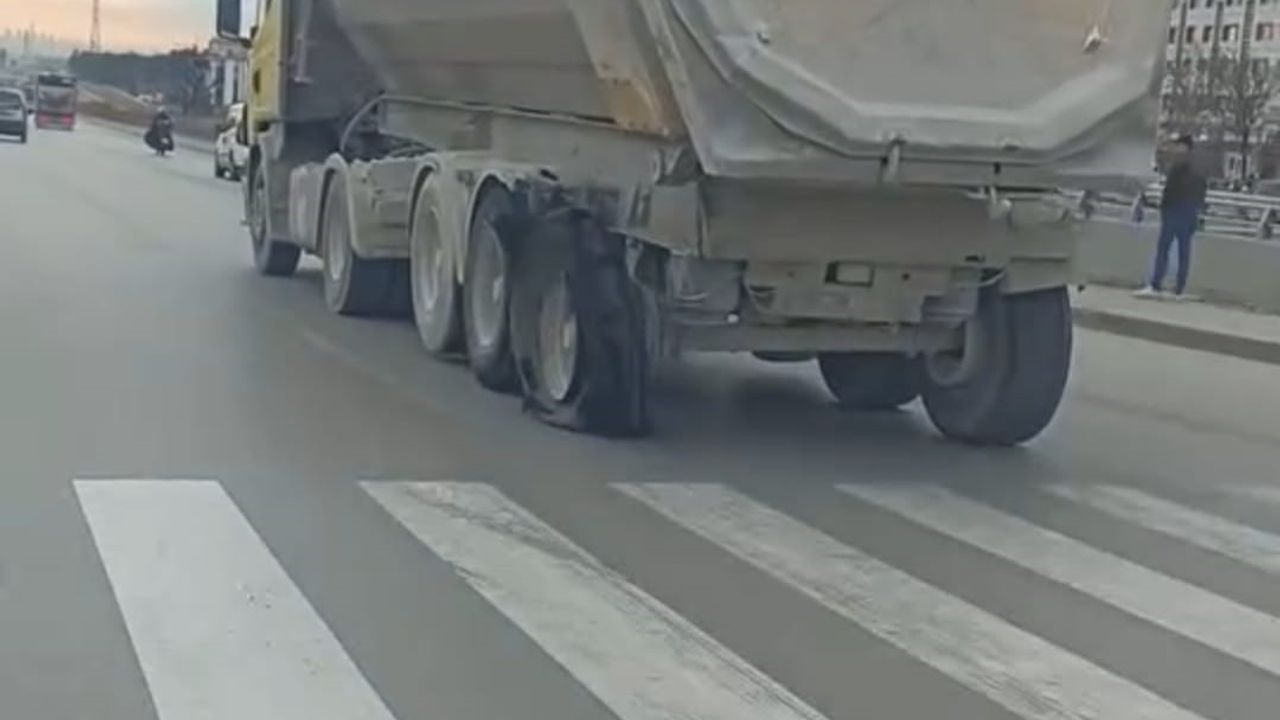 Sincan ilçesi Ayaş Yolu mevkisinde kaydedilen görüntülerde bir hafriyat kamyonu sürücüsünün, aracının sol arka lastiğinin patlak olmasına rağmen ilerlediği görüldü. Trafik güvenliğini tehlikeye sokan sürücünün o anları ise arkasında ilerleyen başka bir sürücünün cep telefonu kamerasına yansıdı.