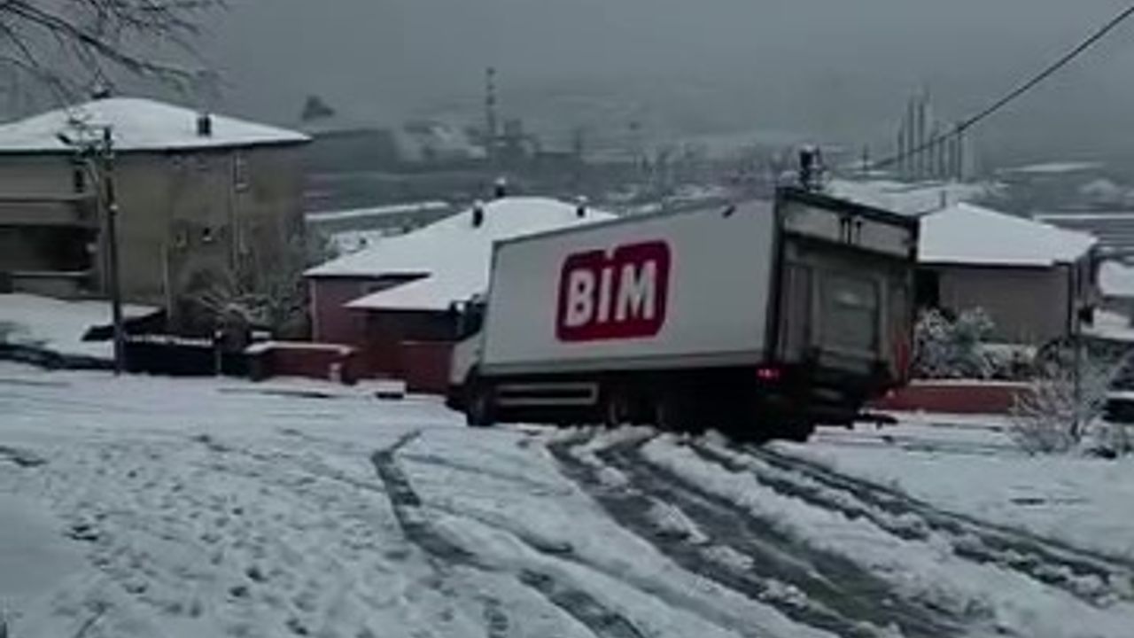 Seyir halindeki BİM’e ait kamyon da karlı yolda kaldı. Rampadan inmeye çalışan araç, yan yan kayarak kaza riski taşıdı. O anlara şahit olan ve kayda alan vatandaşlar, "Aracı devireceksin, aşağıya devam et. Tekerler kalkıyor. Kal böyle" diyerek muhtemel kazanın önüne geçmeye çalıştı.