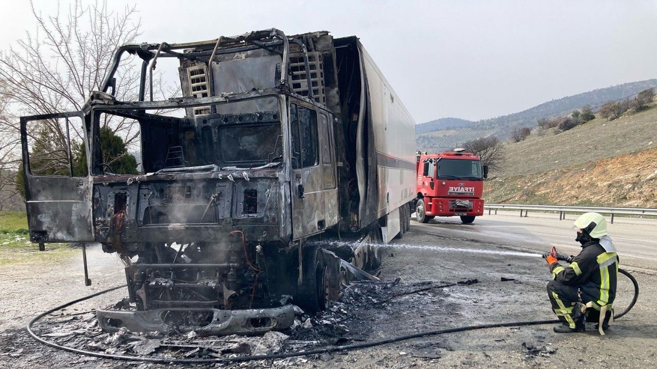 Yangın saat, 12.30 sıralarında İzmir - Ankara D300 kara yolu Kovukdere Rampaları’nda meydana geldi. Edinilen bilgiye göre İzmir istikametinden Uşak istikametine seyir halinde olan Azerbaycan uyruklu Mahmudov Tural idaresindeki 90 ZJ 186 plakalı tır, Kovukdere mevkiine geldiğinde henüz neden çıktığı bilinmeyen bir sebeple alev aldı. Aracından duman çıktığını gören tır şoförü aracını yol kenarında bulunan cepte durdurdu. Araçtan yükselen dumanları gören vatandaşların 112 Acil Çağrı Merkezi’ne bildirmesi üzerine olay yerine itfaiye ve jandarma ekipleri sevk edildi. Kısa sürede olay yerine varan itfaiye ekiplerinin yangına müdahalesi sonucu yangın daha fazla büyümeden kontrol altına alındı. Yangın sonucu tır kullanılamaz hale geldi. Alev alan tır kullanılamaz hale gelirken tırın sürücüsü yangını yara almadan atlattı.