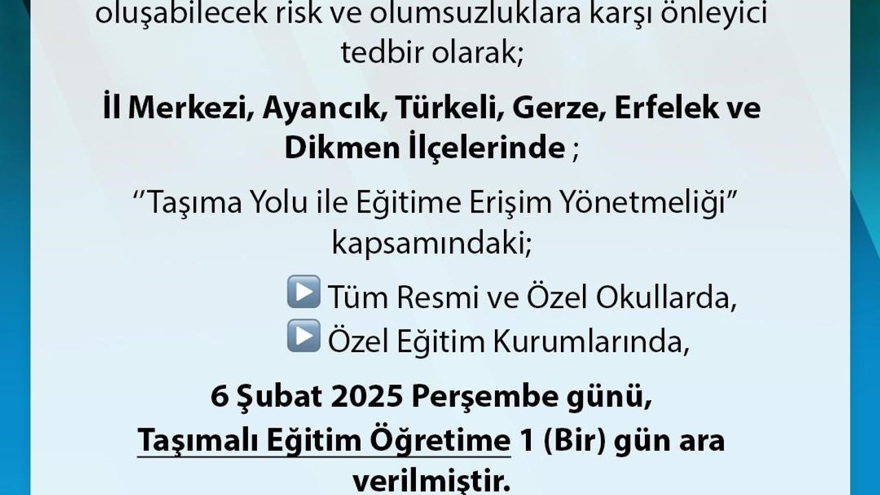 Sinop Valiliği’nden yapılan açıklamada, ‘’İlimiz genelinde etkili olan kar yağışı nedeniyle, oluşabilecek risk ve olumsuzluklara karşı önleyici tedbir olarak; il merkezi, Ayancık, Türkeli, Gerze, Erfelek ve Dikmen ilçelerinde; ‘Taşıma Yolu ile Eğitime Erişim Yönetmeliği’ kapsamındaki; tüm resmi ve özel okullarda, özel eğitim kurumlarında, 06 Şubat 2025 Perşembe günü, taşımalı eğitim- öğretime 1 gün ara verilmiştir’’ ifadelerine yer verildi.