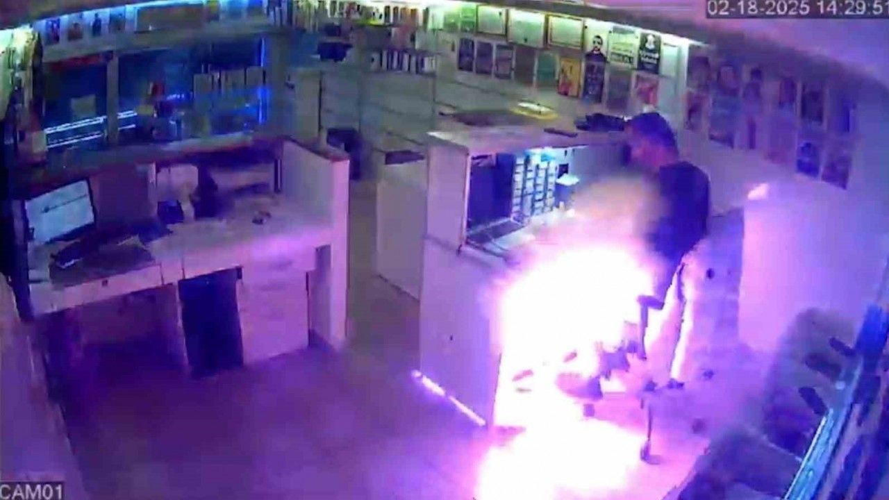 Olay, merkez Tophane Mahallesi üzerinde bir cep telefonu tamircisinde meydana geldi. İşletmeci Gökhan Akyıldız bataryası şiştiği için tamire getirilen telefonu masanın altındaki ahşap çekmeceye koydu. O esnada öncesinde sipariş ettiği yemek gelen Akyıldız, yemek yemeye başladı. Bir anda patlayan telefon alev alarak yere düştü. Bir anda oturduğu yerden fırlayan Akyıldız masanın altında alev alan telefonu ve üzerine düştüğü için yanmaya başlayan ayakkabıları söndürmeye başladı. Telefonun patladıktan sonra düştüğü yer ile Akyıldız arasında bulunan metal elektrikli soba sayesinde ise kendisi yara almadan kurtulmuş oldu. O anlar ise anbean işletmenin güvenlik kamerasına yansıdı.