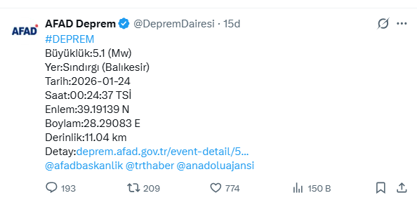 Balıkesir'in Sındırgı ilçesinde saat 00.24'te 5.1 büyüklüğünde bir deprem meydana geldi. İstanbul dahil birçok şehirden hissedilen deprem paniğe neden oldu.