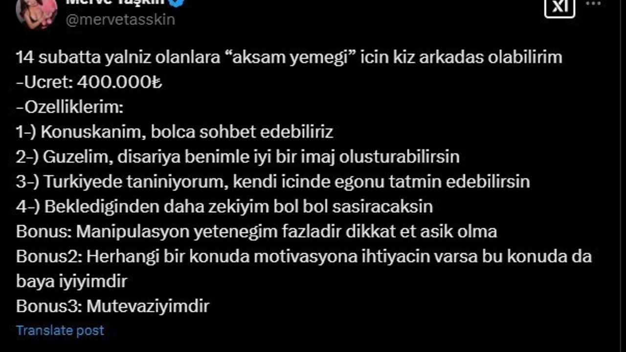 Sosyal medya fenomeni Merve Taşkın, 14 Şubat’ı yalnız geçirecek olanlara ’akşam yemeği’ ilanı adı altında mesaj yayınlamıştı. Paylaşım sonrası fenomene sosyal medya kullanıcıları tepki gösterirken, Taşkın’ın bu paylaşımına yönelik CİMER’e şikayet yağdı.