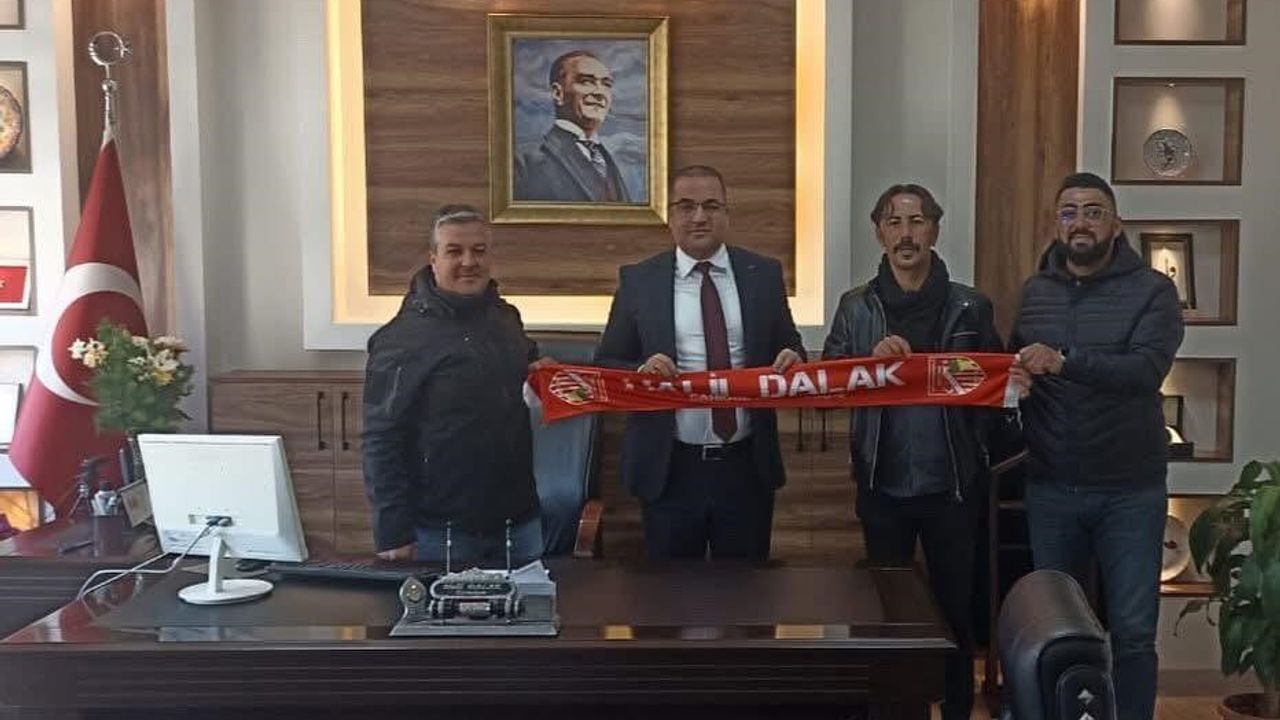 Sarıgöl Gençlerbirliği Belediyespor Taraftarlar Derneği üyeleri Sarıgöl Kaymakamı Halil Dalak’ı ziyaret ederek takımın kırmızı-beyaz atkısını hediye etti.