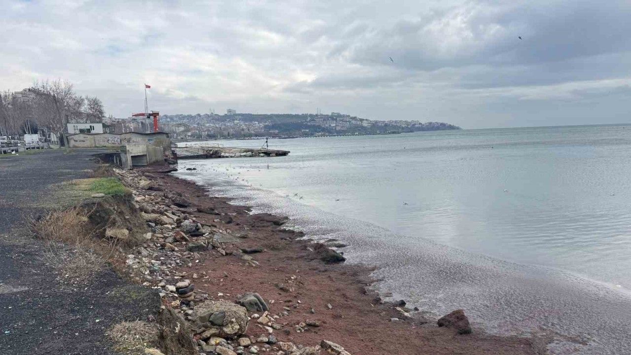 Poyraz fırtınasının etkili olduğu Tekirdağ’ın sahil bandı kızıl yosunla kaplandı.