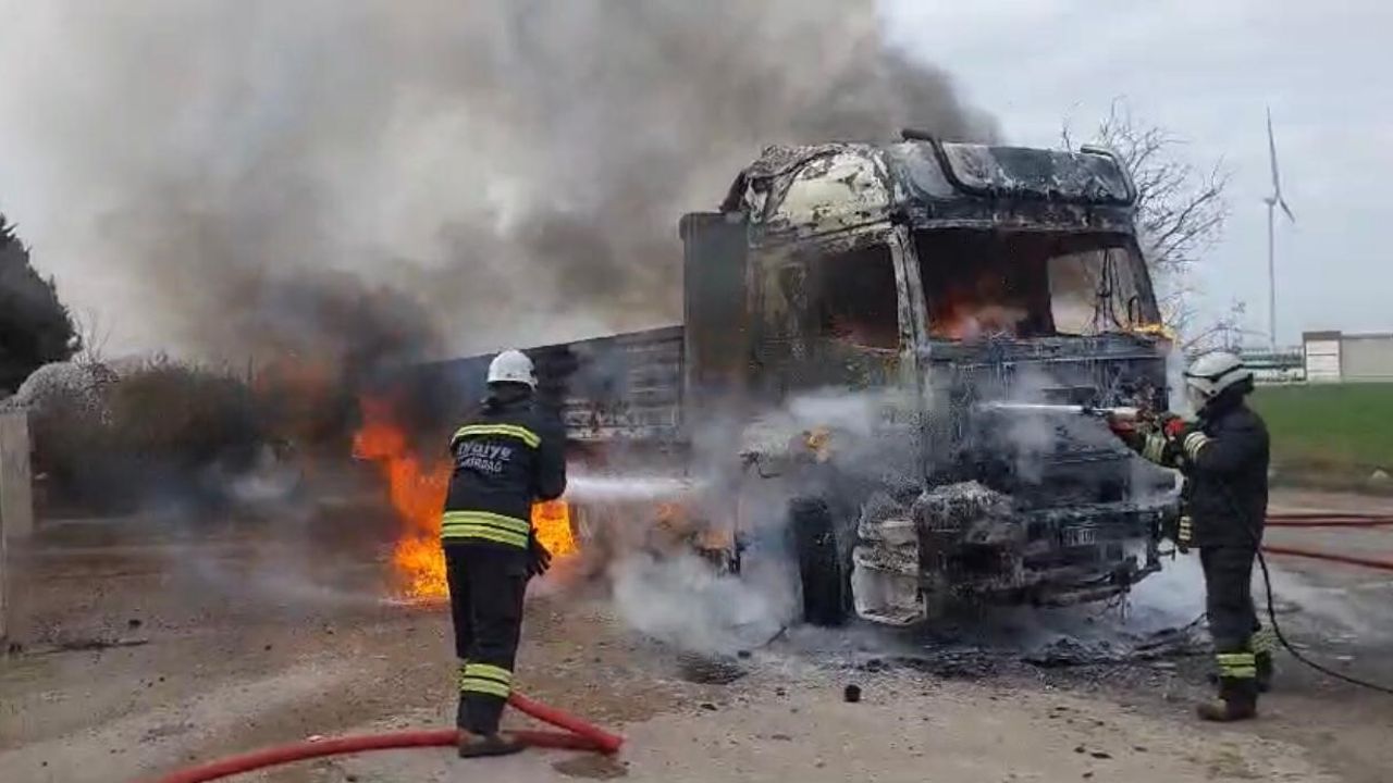 Tekirdağ’ın Ergene ilçesinde park halindeyken alev alan tır yanarak kullanılamaz hale geldi.