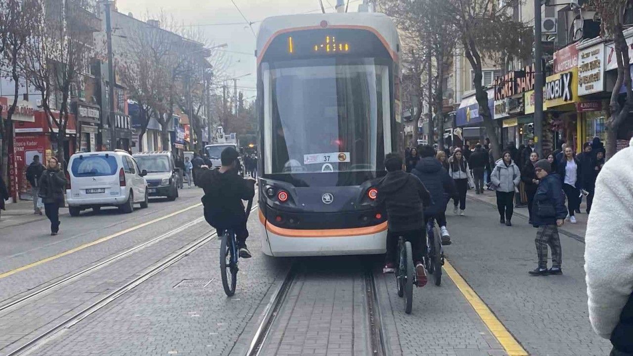 Eskişehir’de 3 bisikletli çocuğun tramvayın arkasına tutunarak seyrettiği ve canlarını tehlikeye attığı anlar görenleri endişelendirdi.