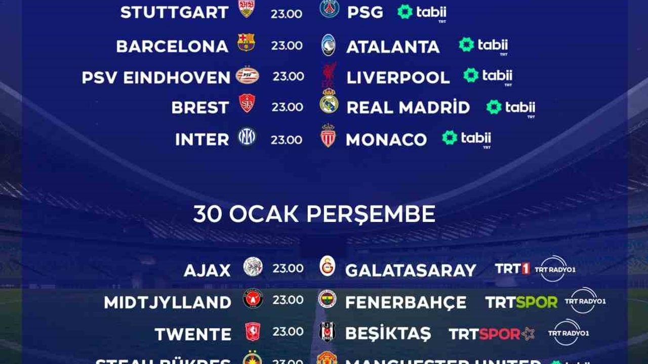 UEFA Şampiyonlar ve Avrupa Ligi’nde 29-30 Ocak tarihlerinde oynanacak 16 karşılaşma canlı yayınla TRT 1, TRT Spor, TRT Radyo 1 ve tabii platformundan futbolseverlerle buluşacak.
