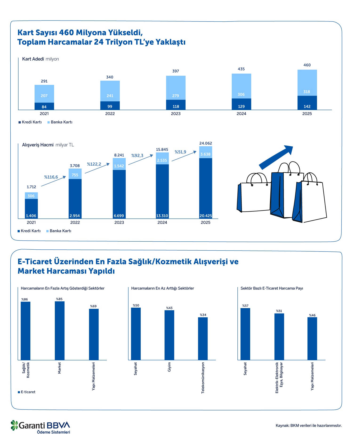 “Türkiye’de Kartlı Ödemeler 2025” çalışmasına göre, 2025 yılı sonu itibarıyla Türkiye’de toplam banka ve kredi kartı sayısı bir önceki yıla göre %5,8 artarak 460 milyon adede ulaştı. Bu kartların 142 milyonunu kredi kartları, 318 milyonunu ise banka kartları oluşturdu. Banka ve kredi kartlarıyla yapılan toplam alışveriş hacmi %51,9’luk artışla 24 trilyon 62 milyar TL seviyesine yükseldi. Toplam harcamaların 20 trilyon 425 milyar TL’si kredi kartlarıyla, 3 trilyon 638 milyar TL’si ise banka kartlarıyla gerçekleştirildi.
