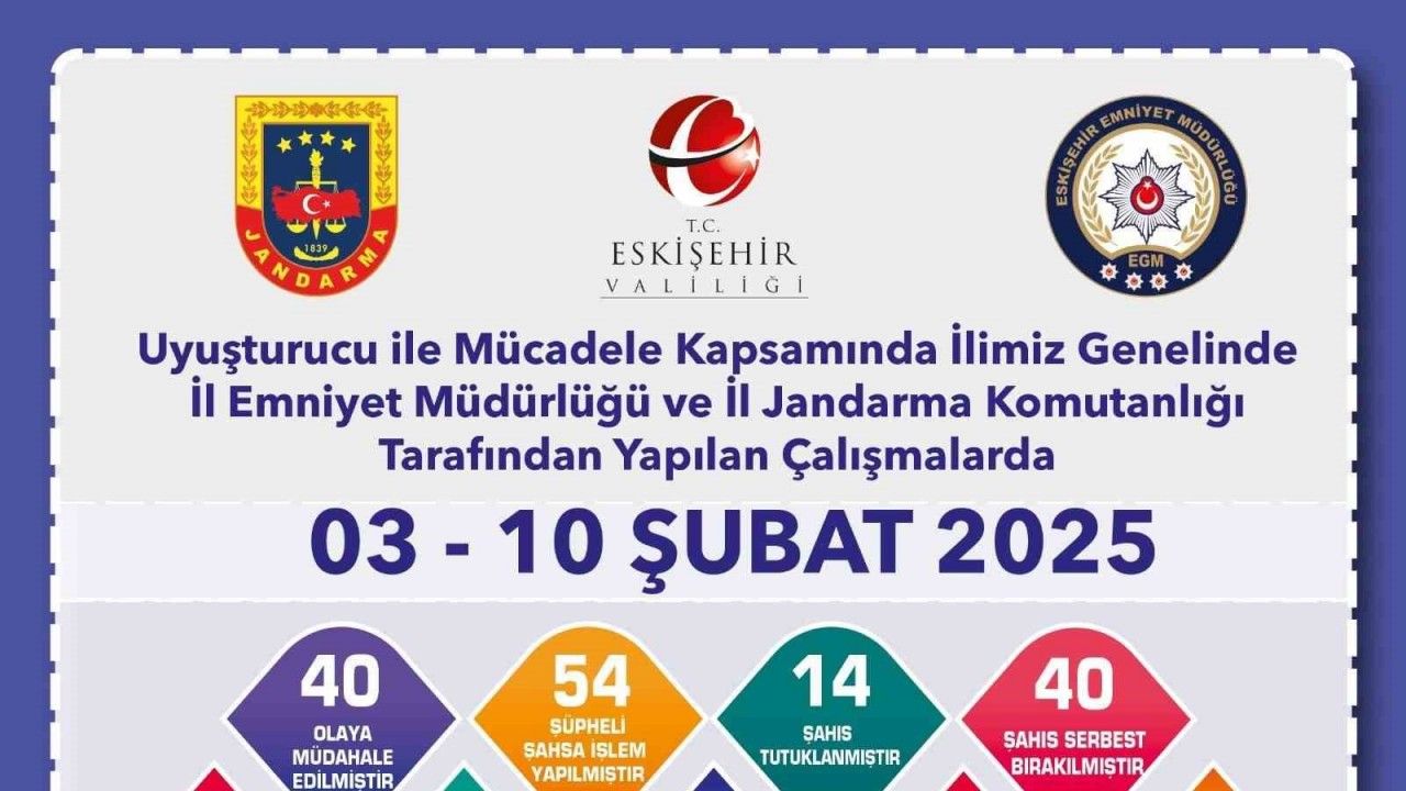 Edinilen bilgilere göre, Eskişehir İl Emniyet Müdürlüğü ve İl Jandarma Komutanlığı ekipleri tarafından uyuşturucu ile mücadele çerçevesinde çalışma yapıldı. Kent genelinde 3-10 Şubat 2025 tarihleri arasında gerçekleştirilen çalışmalarda; 40 olaya müdahale edilirken, 54 şüpheliye işlem yapılıp, 14 şahıs tutuklandı ve 40 şahıs serbest bırakıldı. Ayrıca, 11,76 gr metamfetamin maddesi, bin 118 adet sentetik ecza hapı, 125,40 gr esrar maddesi, 2 adet hassas terazi ve 79,92 gr bonzai maddesinin ele geçirildiği öğrenildi.