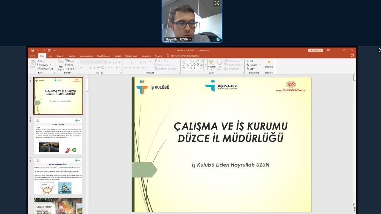 Düzce Üniversitesi Kariyer Geliştirme ve Mezun İzleme Uygulama Araştırma Merkezi tarafından öğrenciler ve mezunların kariyer planlamalarını bilinçli bir şekilde yapmalarını desteklemek amacıyla düzenlenen "Kariyer Haritanı Çiz: Hedeflerini Belirle ve Geleceğini Şekillendir" başlıklı seminer çevrim içi olarak gerçekleştirildi.