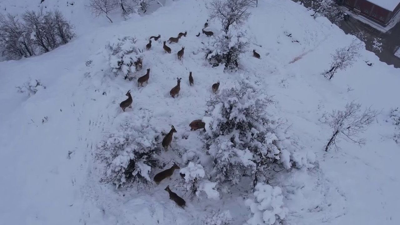 Kar nedeniyle zaman zaman karayollarına kadar inen yaban keçileri, kırsal bölgelerde yer alan maden ocaklarının yakınlarına kadar geliyor. Onlarca yaban keçisi sürüsü kar üzerindeki yolculuğu dron ile görüntülendi.