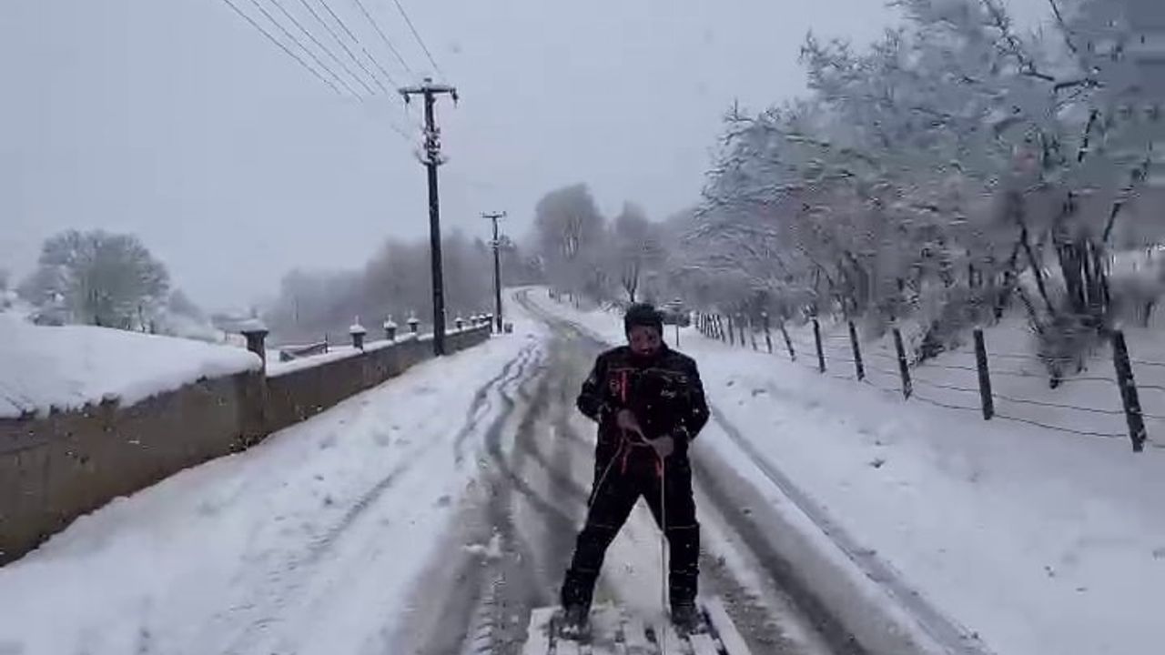 Meteoroloji Genel Müdürlüğü’nün uyarıları sonrasında Sakarya genelinde yoğun kar yağışı etkili oldu. Şehrin yüksek kesimlerinde bazı sokaklar ve grup yolları beyaz örtüyle kaplandı. Kurudere Mahallesi’nde ise kapanan yolda traktörün arkasına bağladığı ipe tutunan vatandaş, ahşap paletle kayak yaparak anın tadını çıkardı. O anlar saniye saniye cep telefonu kamerasına yansıdı.