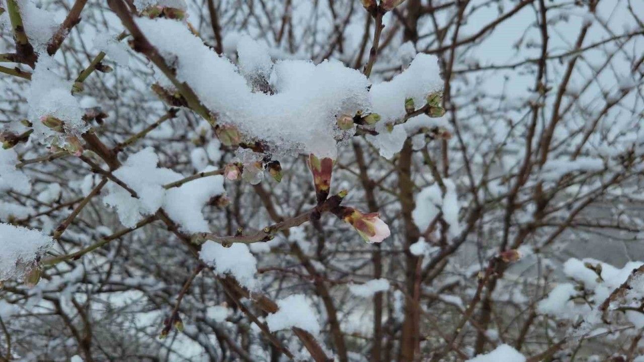 Adıyaman’da mevsim normallerinin üzerinde seyreden sıcaklık nedeniyle çiçek açan badem ağaçları, aniden bastıran kar nedeniyle beyaza büründü.