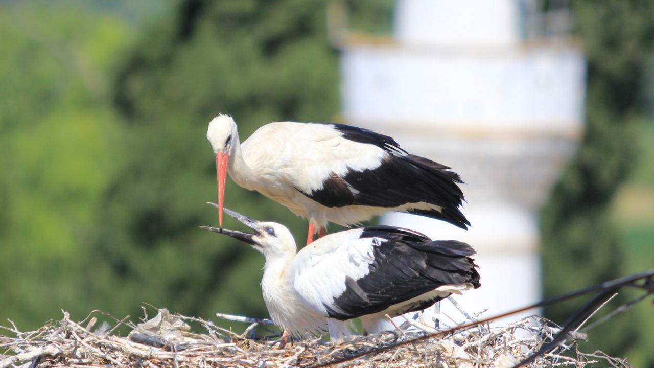 Yumurtadan çıkan yavrular ve onları besleme telaşı içinde yiyecek bulmak için kanatlanan anne ve baba leylekler, mahallede adeta bir görsel şölen oluşturuyor.