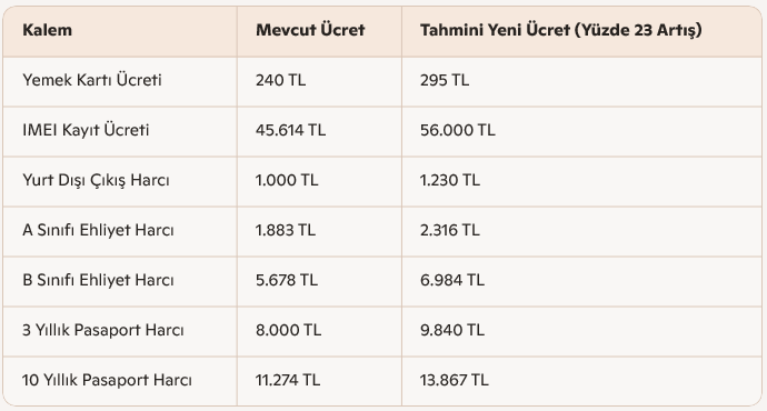 Ekonomistlerin tahminlerine göre YDO’nun yüzde 22 ila 24 arasında olması bekleniyor. Eğer oran yüzde 23 olarak belirlenirse, vatandaşların ödeyeceği ücretlerde ciddi artışlar yaşanacak. İşte bazı kalemlerdeki tahmini yeni tutarlar: