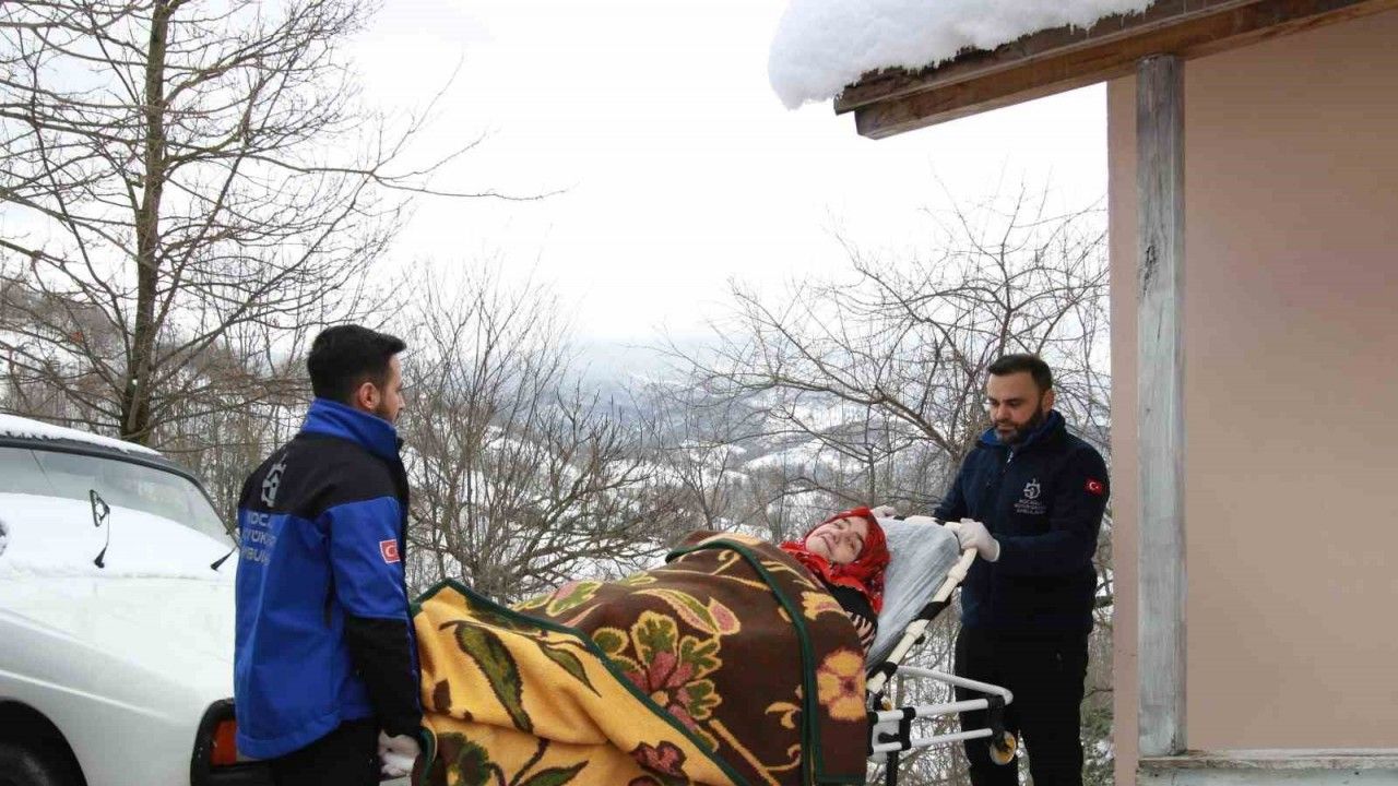 Kocaeli’de hastalığı sebebiyle yürüme kabiliyetini kaybeden kadın her türlü hava şartlarına rağmen belediyenin ambulansıyla hastaneye taşınıyor.